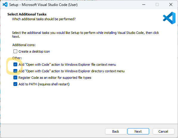 VSCode 설치 파일 다운로드 후에 설치를 진행하시면 됩니다. 설치시 Path 옵션을 체크하시면 됩니다. 다른 옵션이나 선택사항은 기본으로 설치하시면 됩니다.